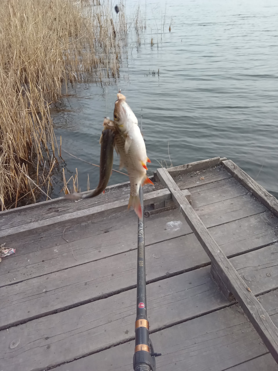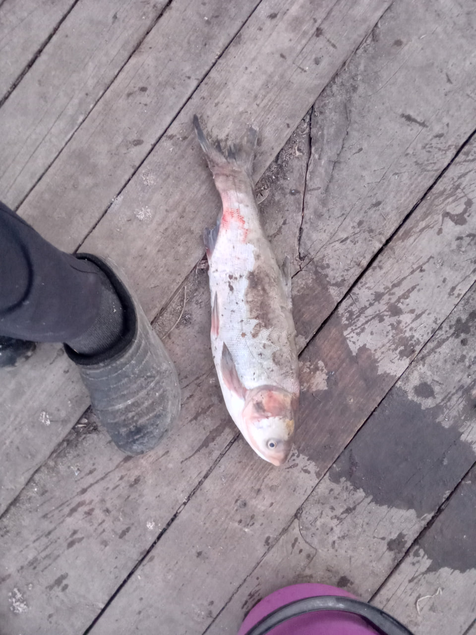 Я вышел на берег в 16 с копейками. В 18-00 начало смеркаться. Вот тут увидел классную поклевку на 5-метровой удочке. Немного притопило, вернуло поплавок на прежнее место и сразу, резко потопило. Подсек. Сразу почувствовал, что на крючке крупняк. Рыба потянула под лед. Развернул. Подтянул к краю окна. Дальше лед. Резко приподнял и выбросил рыбину на лед. Постепенно дотянул до мостика. Это оказался толстолобик, весом в 1.5 килограмма.