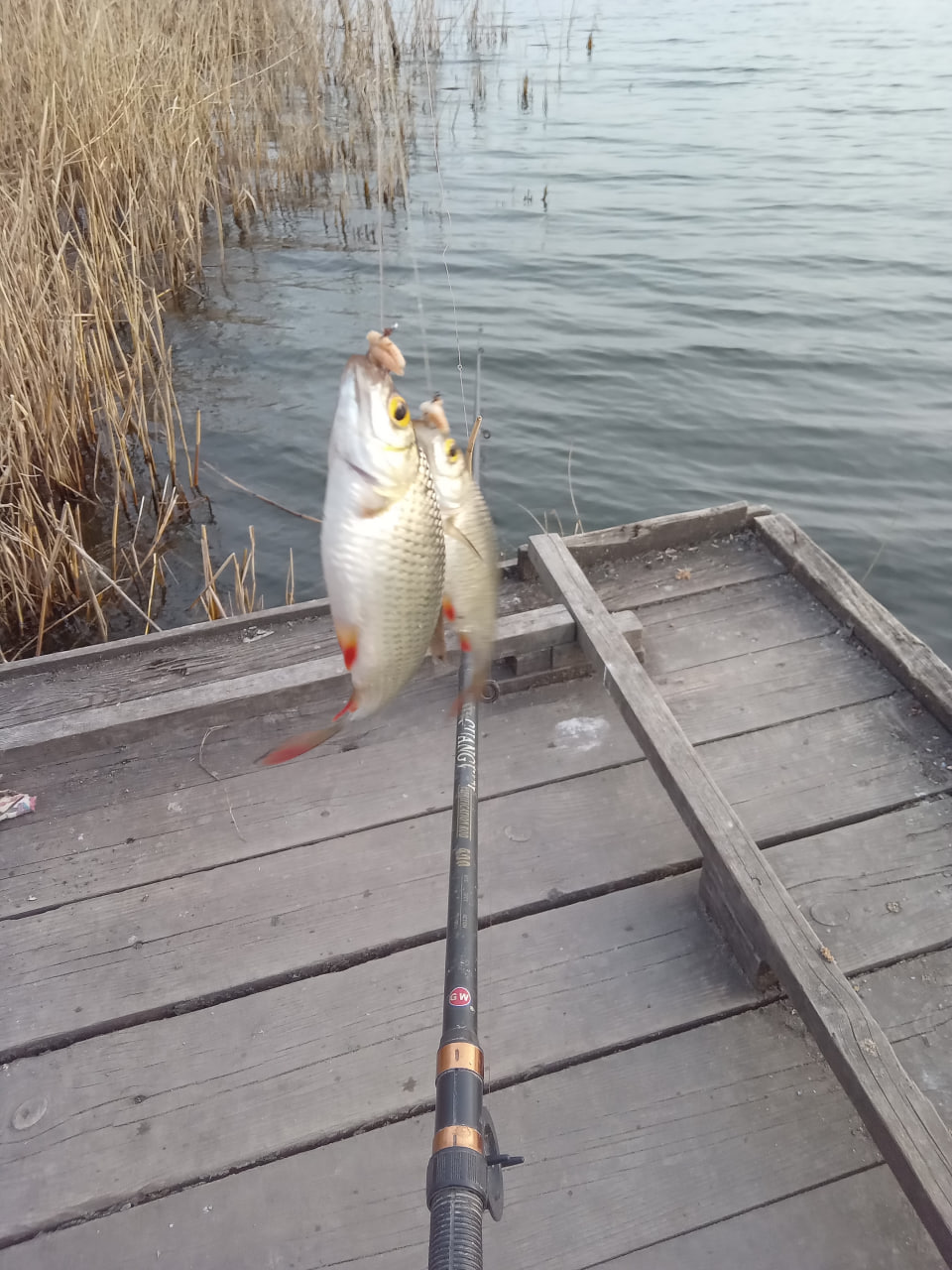 Увидел окно чистой (открытой) воды во льду. Закинул 5-метровую удочку. Смог достать до нужного места. Красноперка клевала довольно активно. Но подобрать глубину, с которой она будет клевать максимально качественно, не получалось.